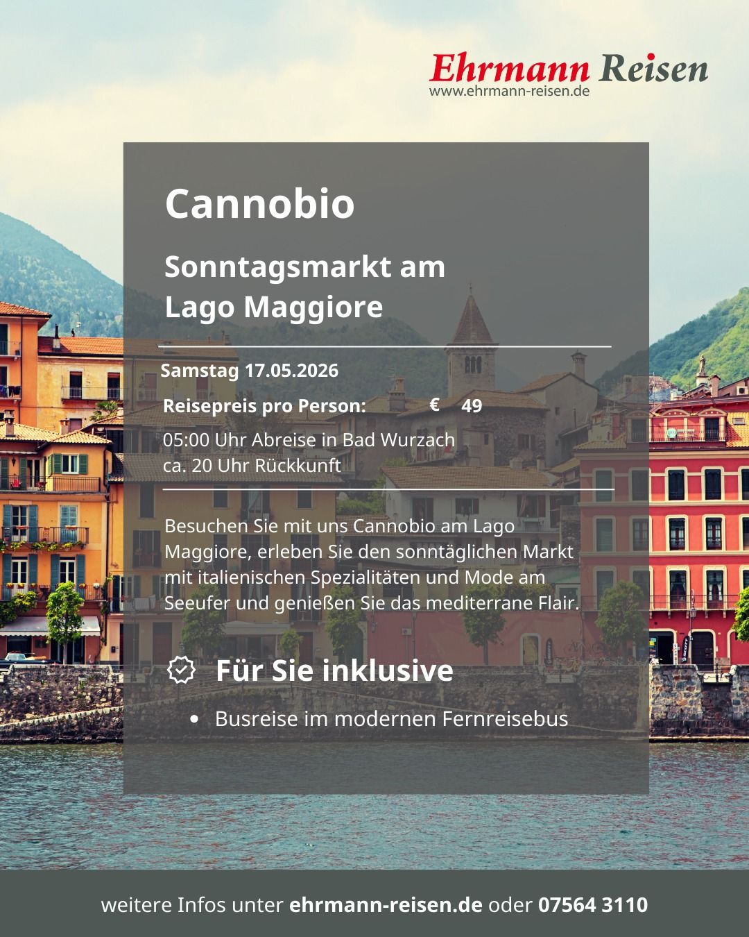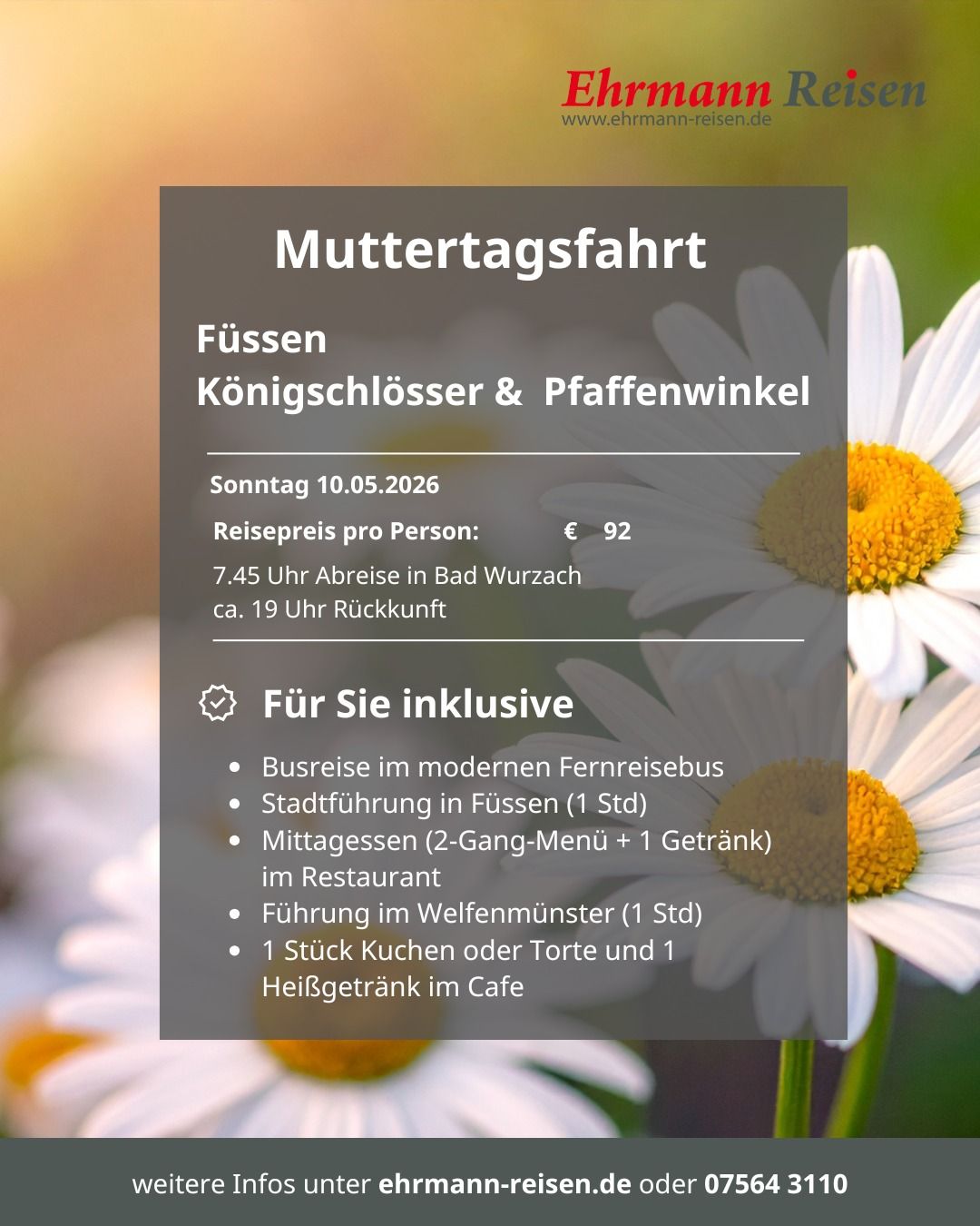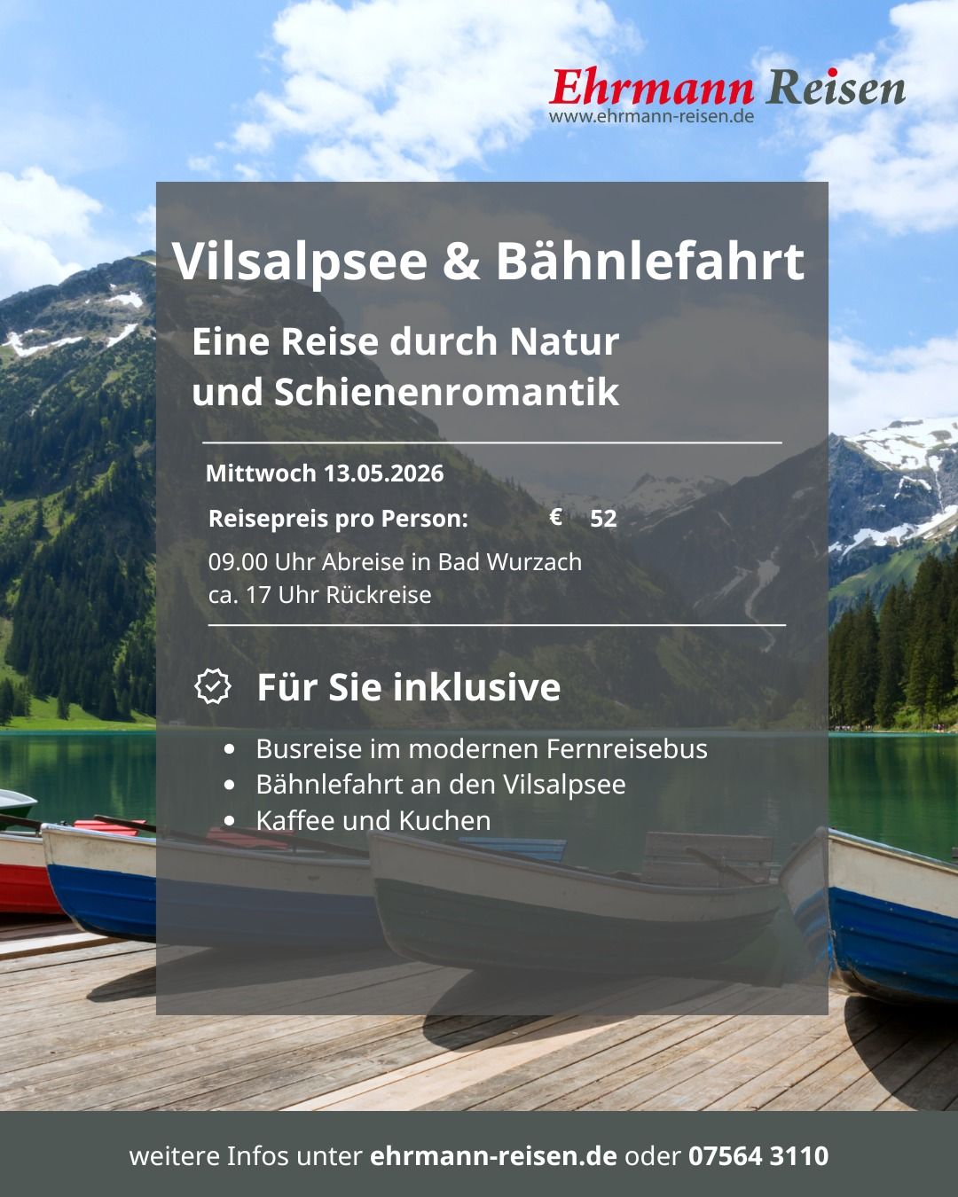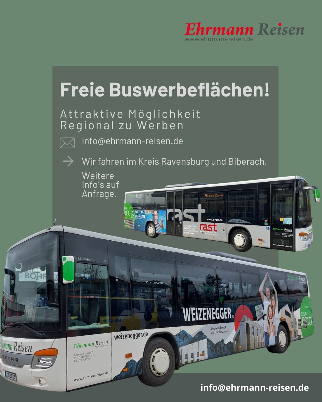 Seit über 50 Jahren widmen wir uns bei Ehrmann Reisen dem sicheren und komfortablen Reisen. Deshalb sind wir stolz darauf, als bodenständiges Familienunternehmen mit langjähriger Erfahrung, unseren Kunden aus der Region und darüber hinaus erstklassige Reiseerlebnisse zu bieten. Wir sind verwurzelt mit der Region in der wir leben. Das macht uns zu einem Partner, der die Bedürfnisse seiner Kunden genau kennt und für eine persönliche Betreuung sorgt.
