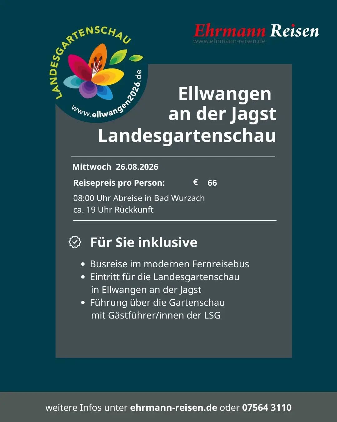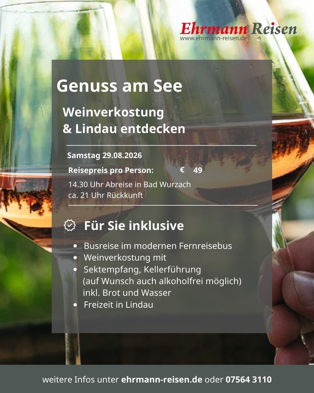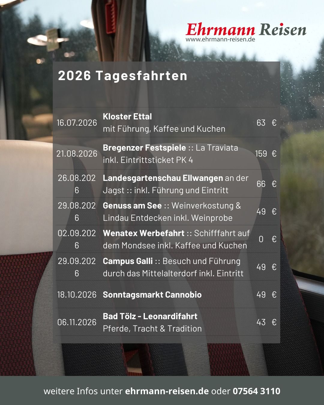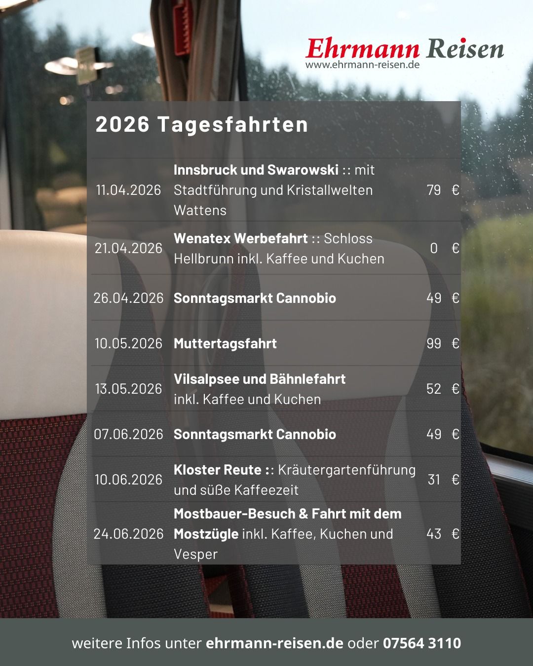 Seit über 50 Jahren widmen wir uns bei Ehrmann Reisen dem sicheren und komfortablen Reisen. Deshalb sind wir stolz darauf, als bodenständiges Familienunternehmen mit langjähriger Erfahrung, unseren Kunden aus der Region und darüber hinaus erstklassige Reiseerlebnisse zu bieten. Wir sind verwurzelt mit der Region in der wir leben. Das macht uns zu einem Partner, der die Bedürfnisse seiner Kunden genau kennt und für eine persönliche Betreuung sorgt.