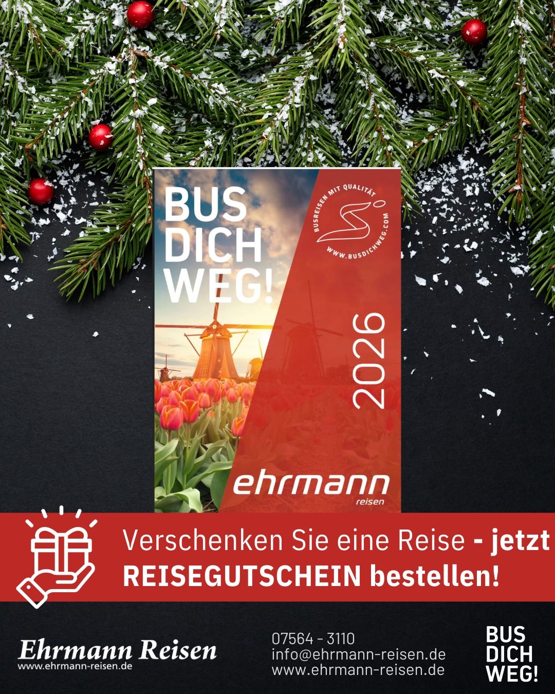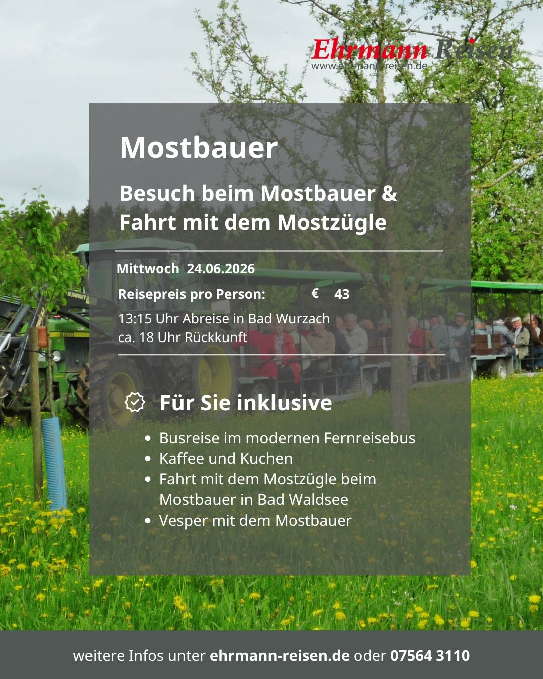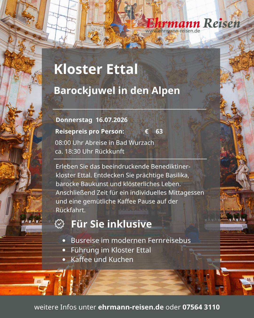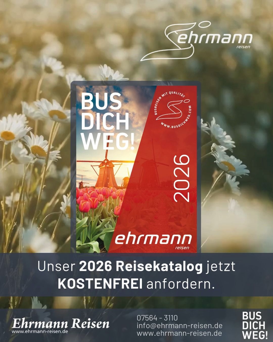 Seit über 50 Jahren widmen wir uns bei Ehrmann Reisen dem sicheren und komfortablen Reisen. Deshalb sind wir stolz darauf, als bodenständiges Familienunternehmen mit langjähriger Erfahrung, unseren Kunden aus der Region und darüber hinaus erstklassige Reiseerlebnisse zu bieten. Wir sind verwurzelt mit der Region in der wir leben. Das macht uns zu einem Partner, der die Bedürfnisse seiner Kunden genau kennt und für eine persönliche Betreuung sorgt.